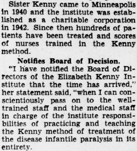 “The famed Kenny treatment for polio is made available at hospitals across the country.”