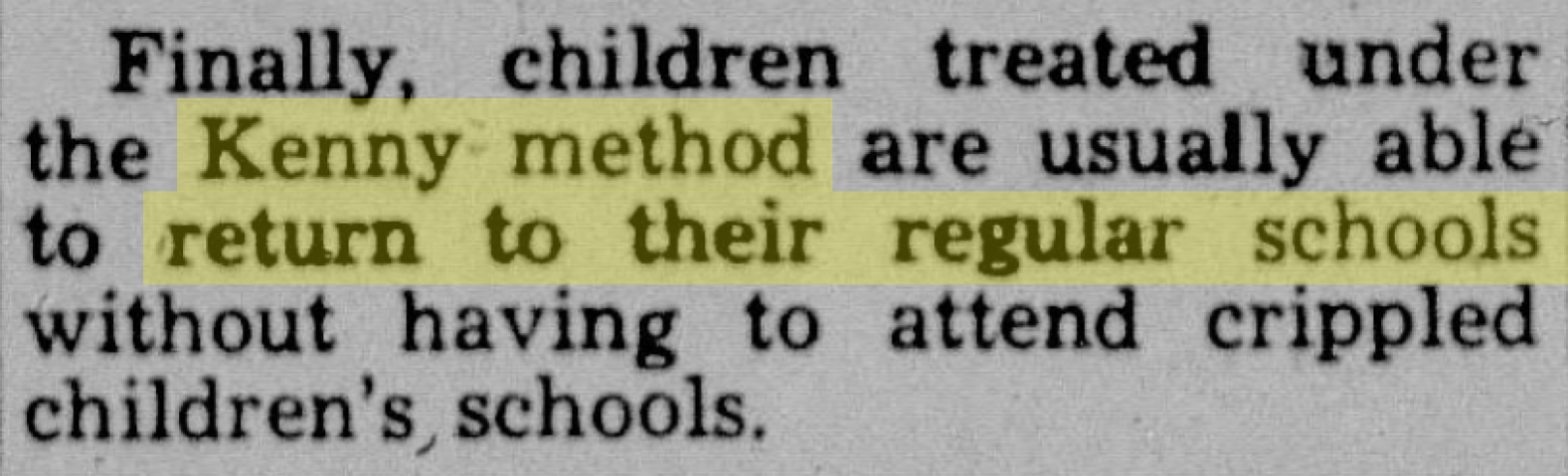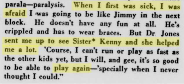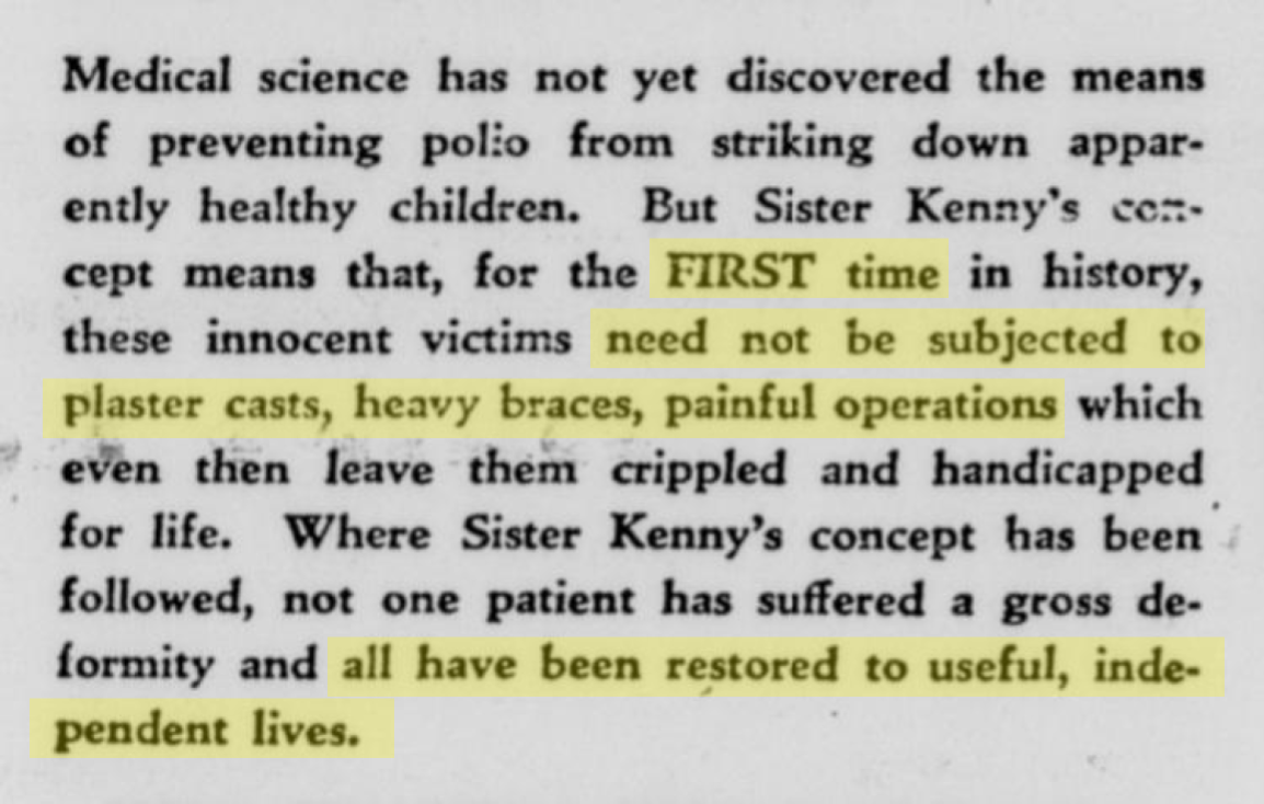 "Sister Kenny's Record: 87 per cent of her patients walk again."